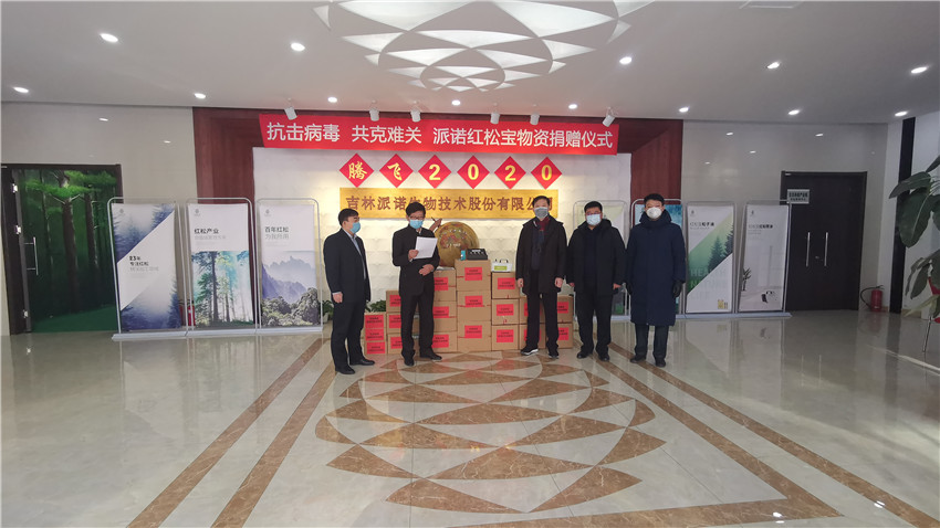 2020年2月2日长春新区北湖开发区党委书记于柏生一行人来到公司总部,领取了公司向社会捐赠的物资——价值二十万元的红松精油消杀系列产品,详单如下:红松植物精油500瓶、红松基多酚手喷空气净化器60套、松林迷雾空气清新喷雾剂30瓶等。红松精油消杀系列产品主要成分为红松多酚精油,经韩国相关专家、科研机构证实,红松精油对冠状病毒拥有很好的消杀功效,能够起到很好的预防作用。